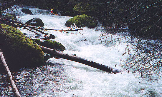 Below this drop are more easily boat scoutable drops and then one last pushy boulder garden above the first road bridge. This last drop doesn't have many eddies and is difficult to safely boat scout. We took out at the bridge because the creek becomes class II-III with wood below that. Rather than deal with this we drove ten minutes across the valley and ran Salmon Creek Gorge.