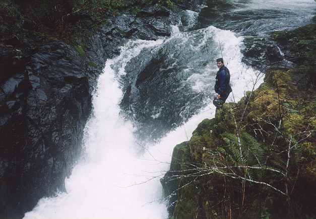 Pete contemplates the hideous hydraulic and impressive undercuts at the base of North Fork Falls.