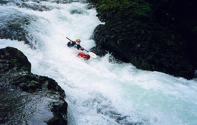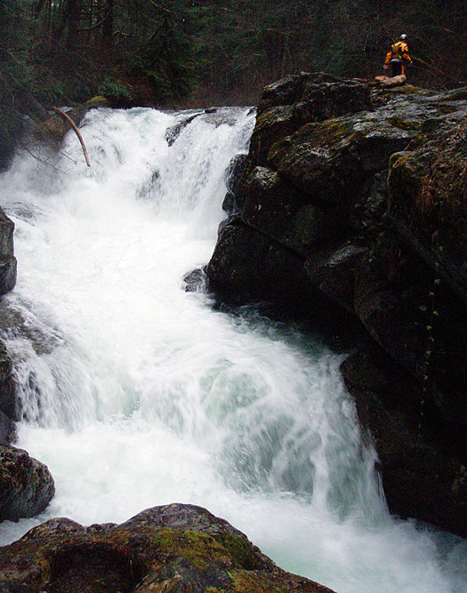 Jesse Coombs finishes scouting the double falls, which he ran without problems. The first drop is easy, but the second drop is very violent and about seven feet wide. It would be easy to get wedged if you were off line.