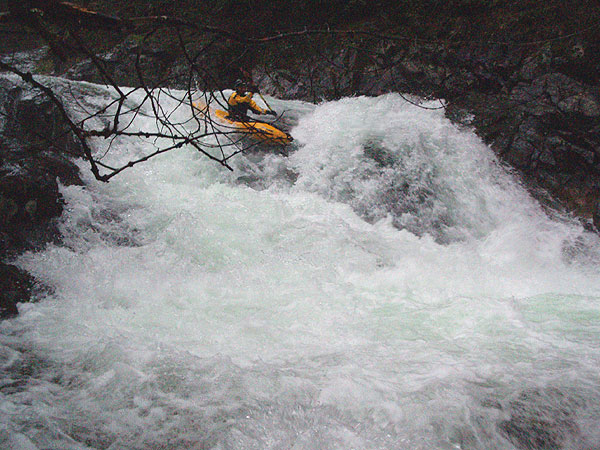 Pete Giordano probes Teakettle Falls. All of the water pours on to a boulder on the right forming a large, backed-up hole, so you have to drive left in order to avoid a piton-beatdown..