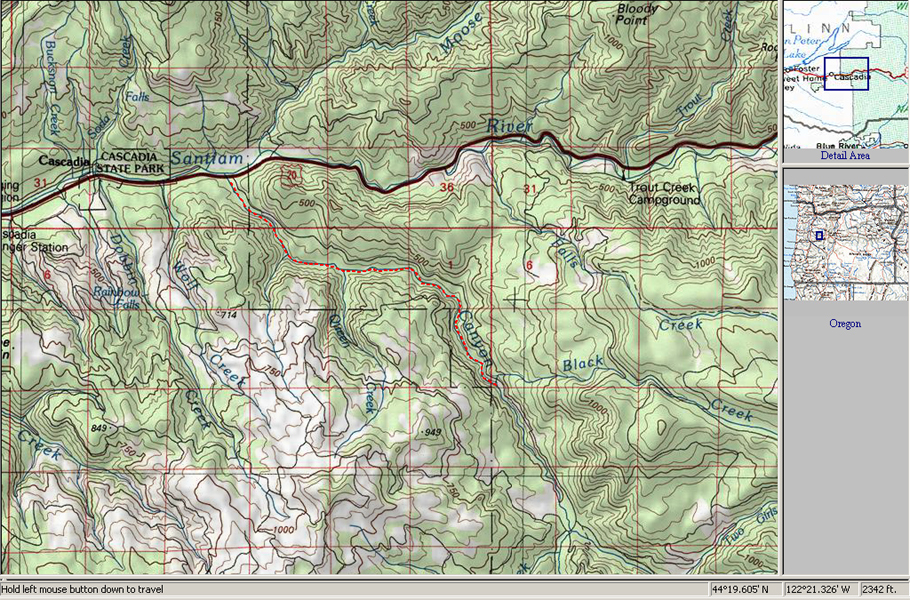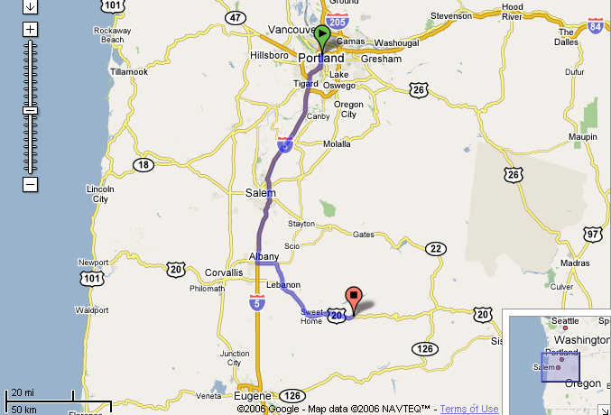 According to Google Maps, the lower take-out at Cascadia is exactly two hours from downtown Portland, one hour and twenty minutes from Eugene, or an hour from Corvallis. The map below shows the driving route from Portland, the most distant population center.