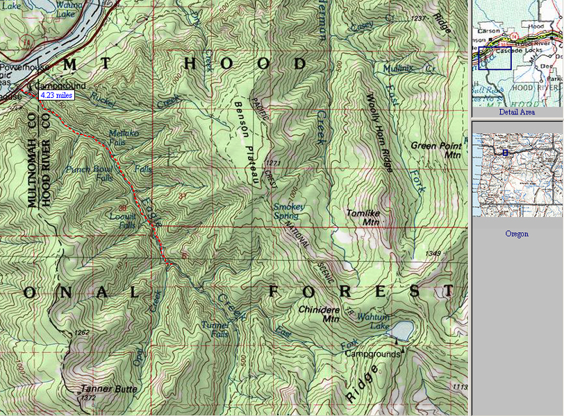 The most often run section of Eagle Creek is indicated by the red line below. There are more big, runnable waterfalls upstream.