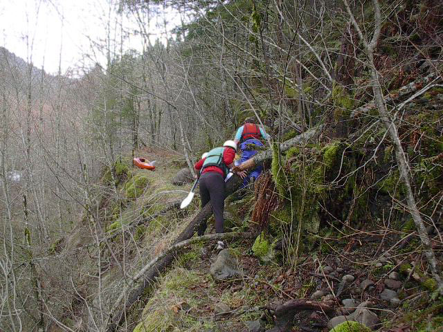 There are three or more huge washouts which you grovel or line through. After an awesome overlook with thick moss on an old gnarled tree, getting down to the river will soon look more feasible, but it is still steep. We took a prominent gully system below a small rock headwall and lowered off trees. Four or so rope lengths down will put you at the creek. It should have taken three or four hours from the car.