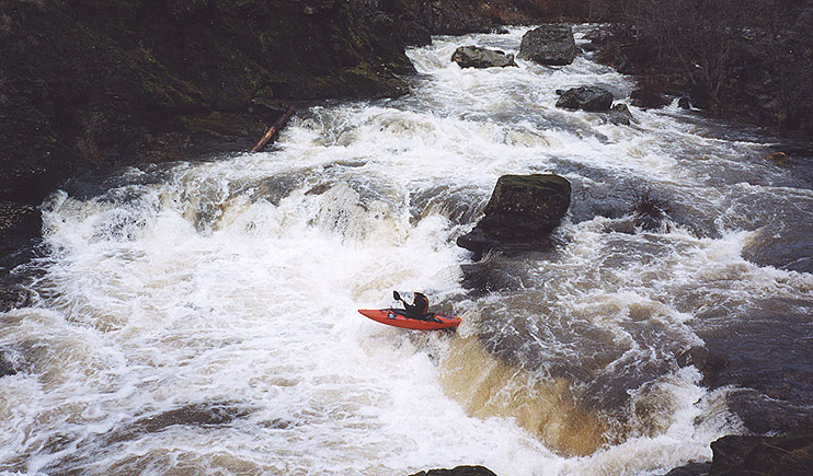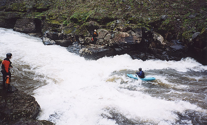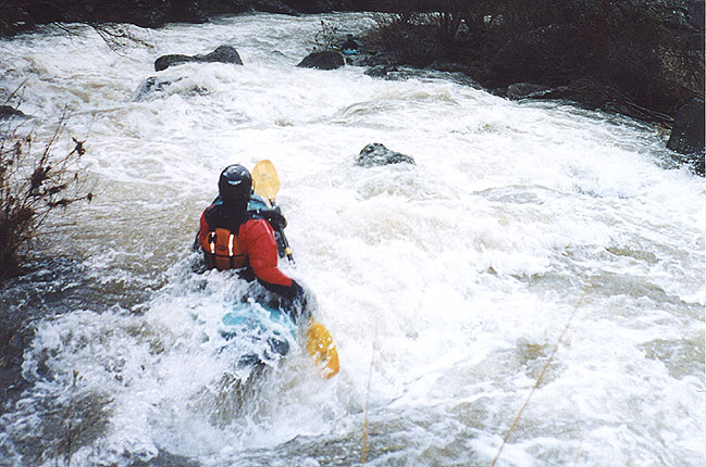 Eric charges down one of the first sizable rapids while Pete watches from the pool below on river-right..
