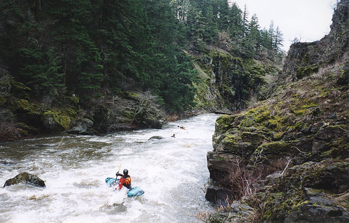 We ran the Little Klick during the flood of 2003. We were long overdue for a flood event, and everyone was a little bit giddy with the sudden surplus of water. On the previous day Pete and I had paddled the June Creek section of the Clackamas at 10,000 cfs on the Three Lynx gauge, so we were definitely tuned up after a day of high-volume hole-bashing.