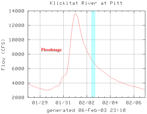 The Main Klickitat at Pitt reaches floodstage around 8500 cfs, and the day we ran this creek the Klickitat at Pitt was 7500 cfs and falling. I would consider this an optimal medium flow. (I have highlighted the time we were on this creek for this trip report in blue.)