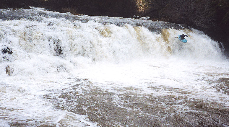 The Falls is rumored to have a few shallow spots in the middle, but Pete and Eric had no problems on the left side. Pete actually hiked back up to run the falls twice, getting a nice boof onto the aerated pile on his second lap over..