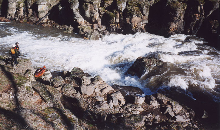 This first drop contains a dangerous, hidden crack somewhere in the center of the rapid that has trapped a couple of paddlers in the past. At this flow it may have been filled in, and we later found out that it is runnable down the far left or right. However, we didn't know that for sure at the time, so a portage seemed to be the wisest option.
