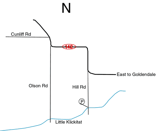 After you start heading South the road will take a hard left (East). At this bend, go straight down onto the dirt road. Follow this until you are just short of the bridge over the L.Klick. The parking area is down just right (downstream) of the bridge, indicated by the 'P' on the map shown below.