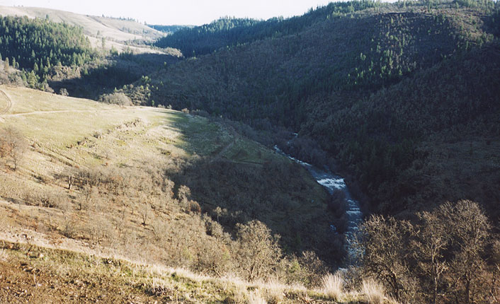 The bottom end of the Little Klickitat Canyon, as viewed from the shuttle road; the canyon zig-zags up through the middle of the photo.