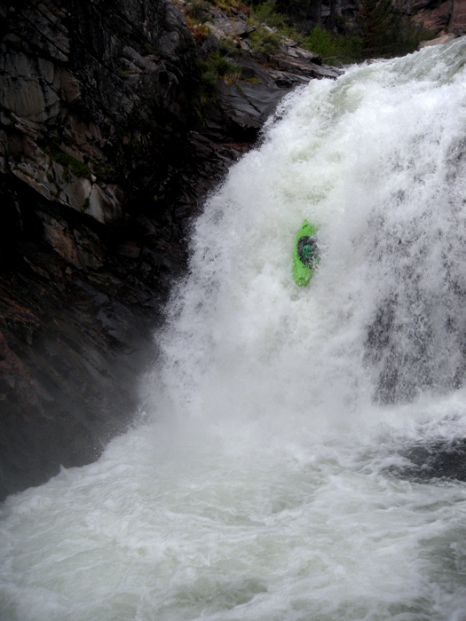 Brady Johnston ran second. He caught the eddy between the two drops on river left and ran far left down drop number two. I ran third and more or less plugged through the seam of drop two after having caught the eddy on drop one. Evan Stafford ran last and boofed the right flake of drop two after also catching the eddy. All lines worked and I can't say one looked better than the other. Go with what the river gives you here, it's an intimidating drop.