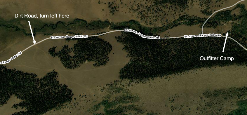 The outfitters camp and the dirt road, courtesy of Google Maps.