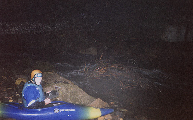 Soon my boat surfaced in the pool again and came swirling lazily back down to us, where I grabbed onto it and dragged it up onto the ledge. After I drained the water out we raced downstream into the growing darkness. Below Straight Creek Falls the creek entered another gorge with some more fun drops, but I don't really remember them because we were moving so fast. It was starting to get too dark to safely move downstream when I heard John yell and I pulled over on the right, where I could faintly see him broached on a rock on the right side of the channel. Once I got closer I could see that he was just upstream of a jumble of wood in fast water. He got out of his boat and we portaged, and after this close call we moved a little more cautiously downstream.