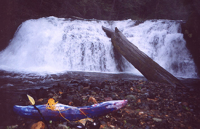 After awhile we determined that it would be possible to run the second falls, assuming that you didn't flip or get trashed and swim in the first one. The hole in the first drop looked big, but punchable. The main problem would be flipping, because if you dropped over the second falls onto the rootwad upside down, it was all over.