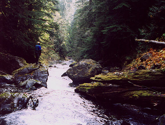 John, peering downstream at the beginning of the good stuff. It's hard to see in this photo, but this pool drops over a narrow six foot ledge right in front of John, and then the gradient jumps up to the 250 fpm range for a quarter mile of high quality class five creekboating.