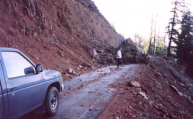 Five miles up the mountain we rounded the corner and saw that a landslide had come down and blocked the road. We got out and saw that it was in fact a huge stump that had slid down, and it wasn't going anywhere anytime soon.