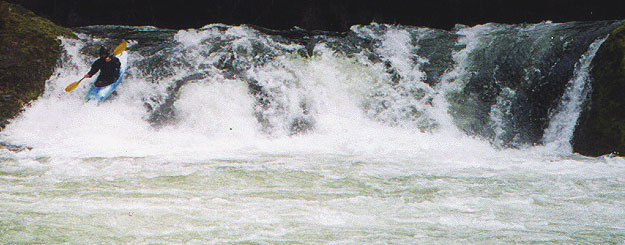 The last major rapid consists of three drops that start where the creek takes a sharp right turn and is almost completely blocked off by an enormous boulder on the left. Catch the large eddy on the left behind the boulder and scramble up on top to scout the first part of this drop. At the top of this rapid the creek narrows down to about ten feet and drops over a uniform three foot ledge. Last year the boof was partially blocked by wood which is now gone. Below here boaters charge down and do a wild airplane turn to the right at the bottom of the second drop, avoiding the large hole river left. Below here is a short pool above the last big drop.