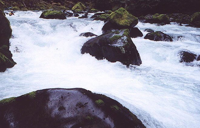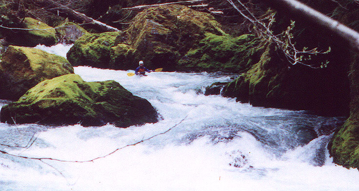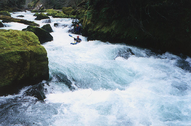Access: From Eugene, take highway 58 to Oakridge. Drive through Oakridge and cross Salmon Creek. Look for the fish hatchery signs and turn left there. Continue up this road for about a mile until it ends at Salmon Creek Road (FS 24). Turn right here and drive 2-3 miles and turn right on a small road (FS 207). Right before FS 207 crosses the creek, a footpath leads off to the right. The footpath crosses the creek about two hundred yards away and this is the take out. You can scout the last III+ rapid from the bridge. Return to FS 24 and drive up to Salmon Creek Falls Park and scout the falls from the wall of the gorge. After scouting the falls, continue up FS 24 and until you see a road (FS 2408) taking off to the right, crossing the creek (an alternate put-in if you want to miss the gorge). The put in for the gorge is 1.5 miles above here. Stay on FS 24 and drive up 1.5 miles, looking for a small rut-filled turnout on the right. Scramble down the path and put in. Don't bother continuing upstream unless you enjoy endless class two with tons of wood.