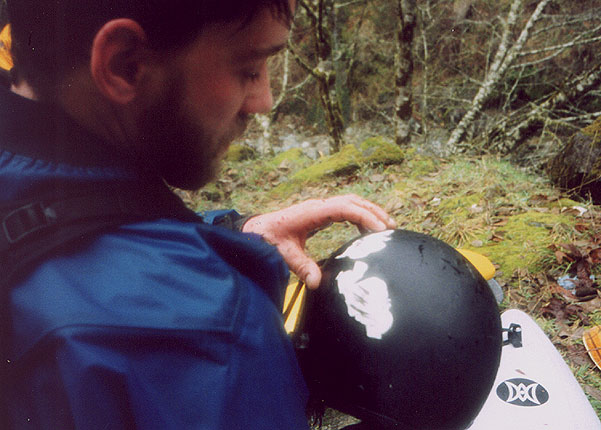 impressive gouges in his helmet after flipping in Broken Brain while doing the first known descent of Sardine Creek.