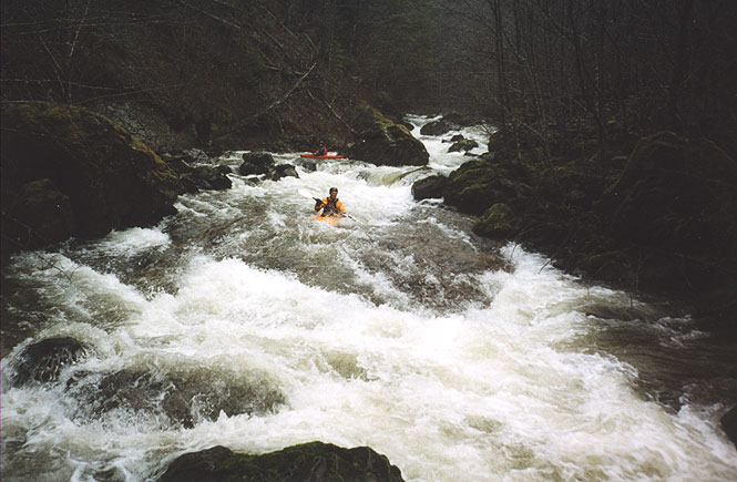 Immediately below this lead-in is a long bed rock slide leading to a horizon line between two boulders; this is the first pin spot and it is pretty serious; the water piles into a savagely jagged rock on the left demanding a strong move to the right in a pushy, twisting chute. I bombed right down this one first without problems, and everyone else quickly followed. (the move was much easier than on previous trips, when the low flows forced you into the rock, though with the increased flow any pin situation would have been much more dangerous.)