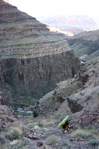 With daylight running short Jon and I ran down the hill to our campsite, giddy with excitement.  After a quick refuel of gorp, snickers, beer, and cheese we dashed back up the hill with our gear. When I say 'dashed' of course, I mean we grunted our way back up the extremely steep pitch above the camp and then up the relatively flat trail above which runs next to Tapeats Gorge ( I’ve got to make a note here that I much prefer climbing around cliffs with a playboat than a creeker ).