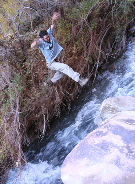 The author jumps across Tapeats Creek during the hike in to Thunder River.