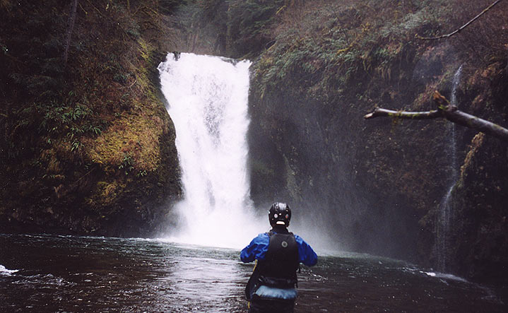 I lined up and dropped over with no speed, letting my bow drop and penciling almost straight in, which is my new waterfall technique: the controlled pencil-in. It was actually a pretty soft hit, and after a one count I surfaced upright and paddled away- no problem!
