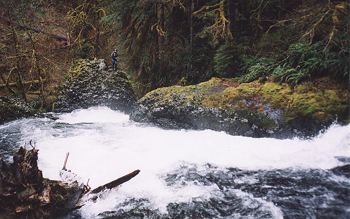 The first mile or so was mellow, class II stuff with nothing much to get excited about. Soon enough though we rounded the corner and saw a big horizon line. I was in the lead so I quickly eddied out and scrambled downstream with my camera. Unfortunately rocky walls below the waterfall were lined with Devils Club, so I ended up taking a few hits on the way down. The waterfall looked really good from below, dropping about 22 feet into a nice deep pool over a uniform ledge. Once I was set Pete gave me the signal and I watched as Tim probed on the left side without problems, and then Pete dropped the middle while I hiked upstream.