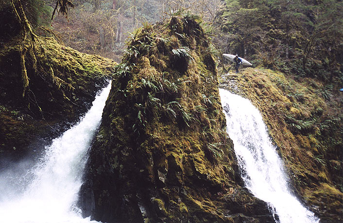 The lead-in to this lower falls was very tricky; the water all slides over a ledge just upstream and accelerates into a huge rock finger that blocks the middle of the creek, before dropping to the right into a very narrow falls. Running this drop upright will be imperative once it is finally done, because there is a slight ledge at the bottom, just waiting to dismember the out-of-control boater. This drop looks very much like Adrenaline Falls in Colorado, only it is not nearly as clean. The portage around the big falls was not that difficult; we were able to follow the trail most of the way down and then rope the boats down the last part. We were also able to portage 'Adrenaline' falls without much difficulty, though this did require some steep scrambling.