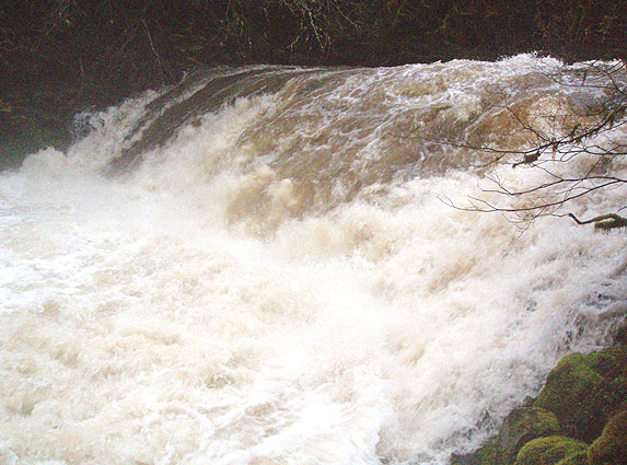 The hideous hole at the base of 12-foot Dirty Falls. This sneaky, dangerous (at least at high water) drop appears after a couple of miles of class two on the lower section. There is an enormous wave-hole guarding the entrance to this falls at high water, making it nearly impossible to run this drop in control. In the past ( at lower flows ) we have run this drop down the right wall, going with the flow through the hole.