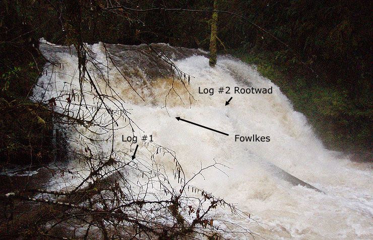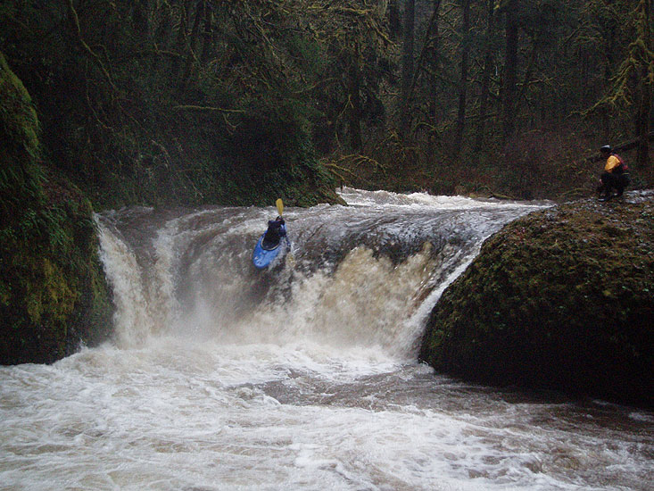 Drake is tricky because there are two logs in it and there is no way to scout the drop from creek level. At this flow the logs were nearly covered but much more dangerous than usual due to the high volume of water piling into the rootwad.