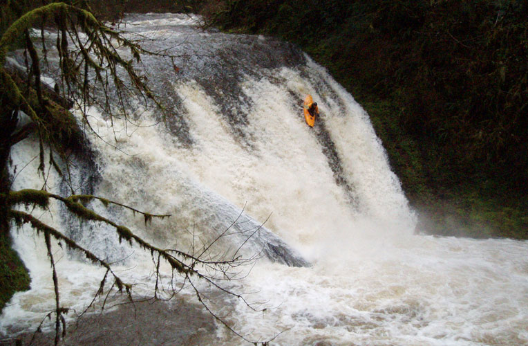 Ryan peeled out and ferried to the the middle of the creek so he could drive left, but the falls funneled him to the right and he corrected perfectly with a strong delayed boof, shown below.. He got flipped by the violent boils at the base of the falls but snapped off a quick roll.