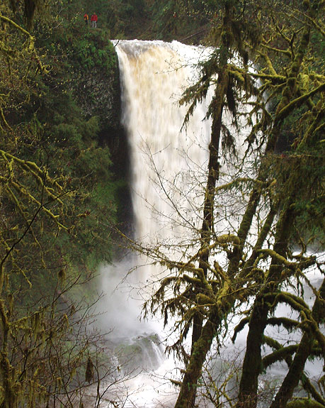 Two hikers ( in red, top left) peer over Middle Silver Falls. This drop is a mandatory portage.
