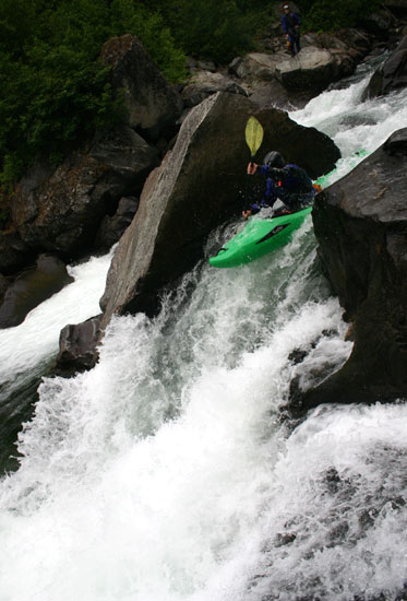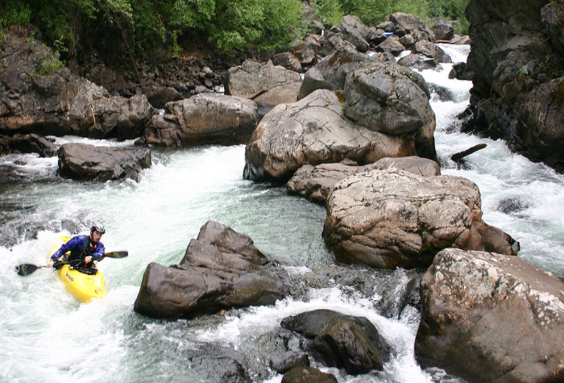 Through this sanctuary we were challenged by a host of rapids. Absent the arduous takeout, the quality of the run was superb. Crystal clear water rumbled over a seemingly endless supply of boulders and raced around the canyon’s constricted bends. The first major rapid presented us with a multitude of different routes over a double horizon line.