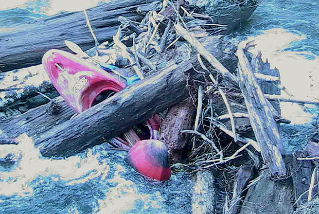 About a hundred yards down stream we notice that the third paddler has wrangled his boat into an eddy and up onto a small ledge on the side of the river. After some creative wading, swimming, and assistance from the fourth paddler, we get boat and swimmer re-acquainted and pull the first breakdown paddle out. Paddler #1 got stuck in a hole just above the big log jam with a smaller log jam making up the river left side of the hole. His options were move river left into log jam...or river right into the meat of the hole. He was trying to move into the meat of the hole for all he was worth so that when he swam he would have a better chance at getting flushed around the monster log jam below him. Finally he pulled and swam his ass off to avoid the log jam, got flushed around it, and climbed up onto his little gravel bar...just a little shaken and a bit banged up from swimming over two more big ledge drops into holes.