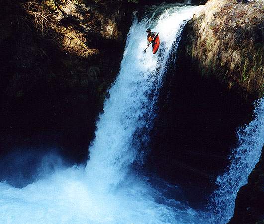 Good boater, bad line. This is the most gruesome run over Spirit I have seen someone paddle away from. He started too far left and caught his bow on the rock outcropping at the lip of the falls. As he fell he flipped completely upside down, landing on his head in the pool below! Since he was the first one over everyone was worried that he was hurt, but he rolled up and shook it off..