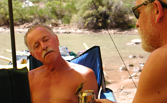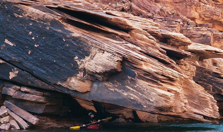 The final day was long and we had a strong head wind so all of the kayakers took turns at the oars. About ten miles below Parachant we were overtaken by an Australian guide who was pushing a gear boat down the river at a brisk pace. He said that he was going to row over 40 miles that day, and that his group was pushing hard to get off of the river because a client had drowned while swimming near their camp ( he got sucked down in an eddyline and wasn't wearing a PFD ) and they were trying to get off of the river as soon as possible. In a remarkable confluence, Ryan actually knew the guy from his days guiding on the Gauley back east, so the guide rested for a moment and got re-acquainted.