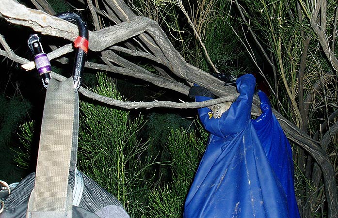 Finally I decided to call it a night, and I headed off to my tent. On the way over, I noticed a small glow in the tree near my tent. The mice had chewed holes in several of Ryan's drybags, so he had started hanging the bags up in the trees, but as I got closer I saw that the mice would not be denied..