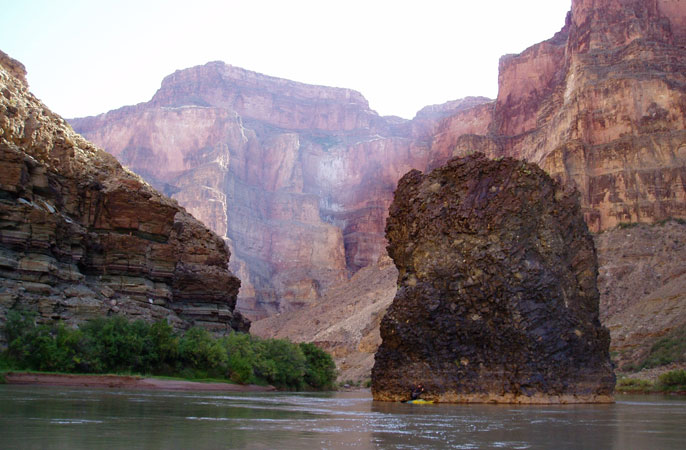 Ryan and I arrived at Vulcan's Anvil, a huge column of jet-black basalt rising out of the center of the river just above Lava Falls. It is traditional to leave an offering or to pay respects here in order to ensure safe passage, and both Ryan and I did so in our own way..