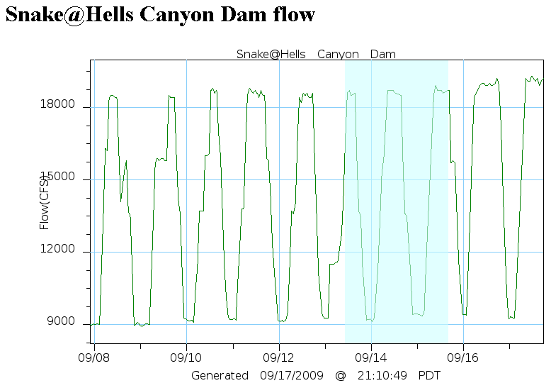 The blue box shows the flows the days we were on the river. The level dropped to around 9,000 cfs in the evening, then in the morning as electricity demand rose it would shoot up to just under 20,000 cfs by noon.