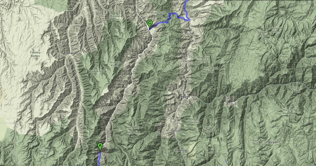Point A on the map is the put in with a purple line showing the road into Hells Canyon.