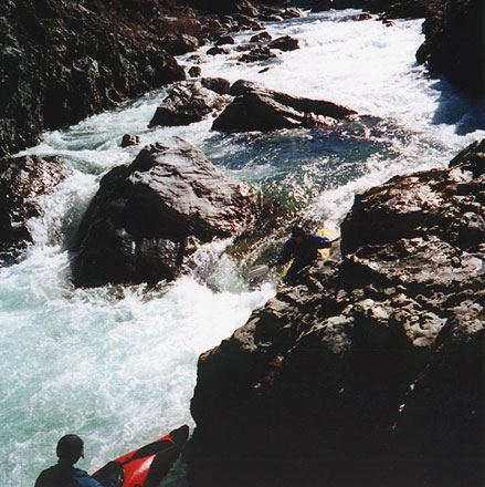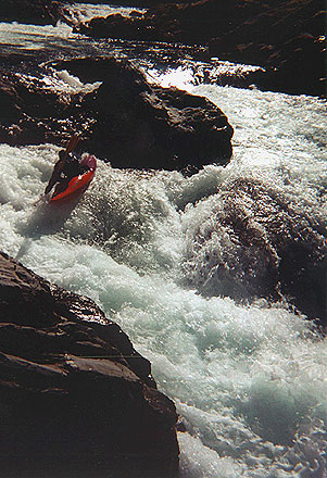 The second memorable series was just downstream. We tried to scout by exiting our boats in some big potholes and climbing up the right wall, but found we could only safely climb about 15 feet. What we could see was a series of holes leading into a big ledge drop, then the current whipped to the right and around a blind corner. The ledge was backed up by a BIG hole, and there appeared to be no eddies available to stop prior to being swept around the corner. This drop we took on faith in a prayer. Gabe led. He flipped below the big ledge, but managed a quick roll and disappeared around the corner. Brad went next, and I brought up the rear. The last I had seen of Brad was him trying to scramble into a small eddy above the blind corner and then falling out of it backward into the unknown.