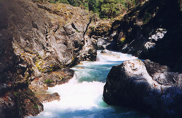 To preface this little tale, Brad Cascagnette, Gabe Flock, and I were on our last day of vacation. It was the end of March 2000. The previous couple days had been spent exploring the North Fork of the Trinity, and then the East Fork of the North Fork. One had been a long, serious, class IV-V wilderness descent; the other had been lazy but scenic class III. After that rest day, we decided to drive downstream to check out the New River. According to the Holbeck and Stanley guidebook, the New was a class IV(V) river that bumped up into class V- when flowing with better than 800 cfs. We all guessed the New was flowing with about 1000-1200 cfs. Compared to the two previous runs, this one looked like a true river.