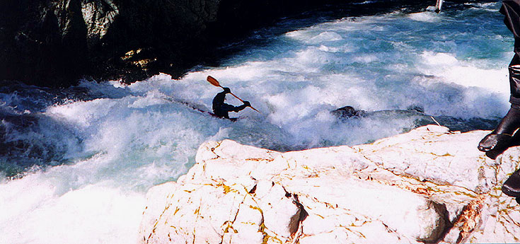 I punched over the big ledge (5-6 foot), settled down a minor backender, and then saw what the corner had hid. A horizon line above a tight twisting 12-foot wide slot and no way to stop. Gabe was out of his boat and yelling something, but I was completely focused and didn't hear a word. It looked like the horizon line might be better on the left (most of the water was going right). So I charged over what turned out to be a 5-foot ledge, caught the corner of a DEEP hole, and then shot out the final slot by moving quickly to the left to avoid getting slammed along a monstrously undercut projecting wall on the right. As I recovered from adrenaline overload, I learned that Brad had just survived the misfortune of taking the drop backwards! I was not envious of his experience. I've nicknamed this class V drop, "Blind Double Date".