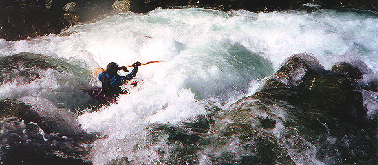 After another short flat stretch the river dropped through the longest and steepest rapid. Another class V. This one had me worried enough that I would have portaged had the rapid been shorter. For the first 50 yards the river dropped over a series of 3-foot ledges and boulders. Towards the bottom nearly all of the water pushed hard towards river left, and that was definitely where you did not want to be. The exit choked down to about 20 feet, and had a 10-foot wide boulder sitting squarely in the middle! The left side slot plunged directly into a badly undercut wall, the boulder appeared undercut to some degree, and only the right slot held safe passage. Even it had most of the current plowing directly into (and under?) the side of the boulder. It looked like the only sane way to run the rapid was to start as far right as possible, fight the current going left, and find your way out of the main channel and into a boulder garden along the right wall. Then just as you were dropping through that final ominous slot, a deft draw on the right should pull you safely away from and past the boulder clogging the exit. At all costs you did not want to get broached end-to-end across the exit slot!