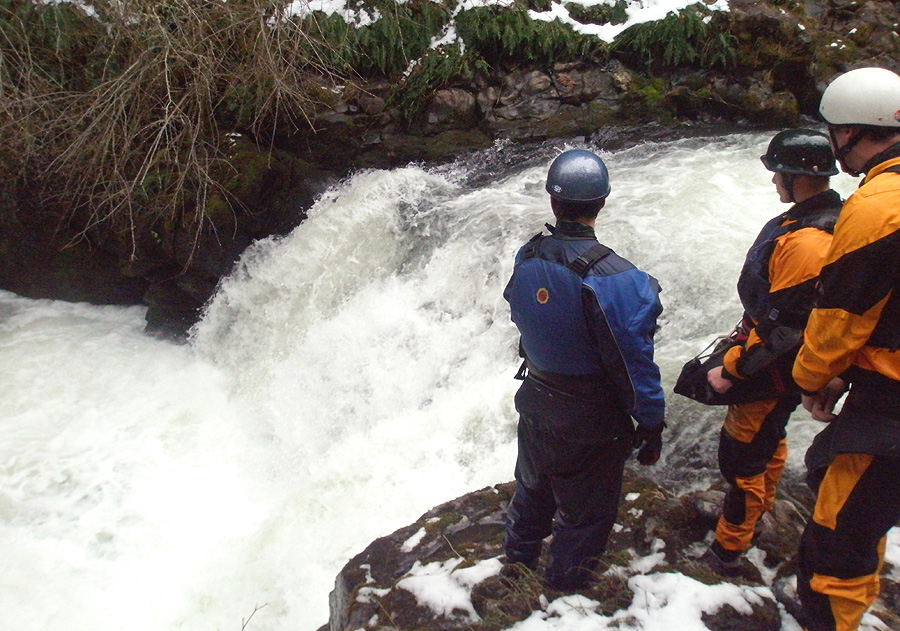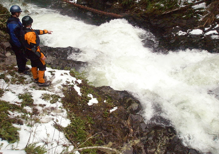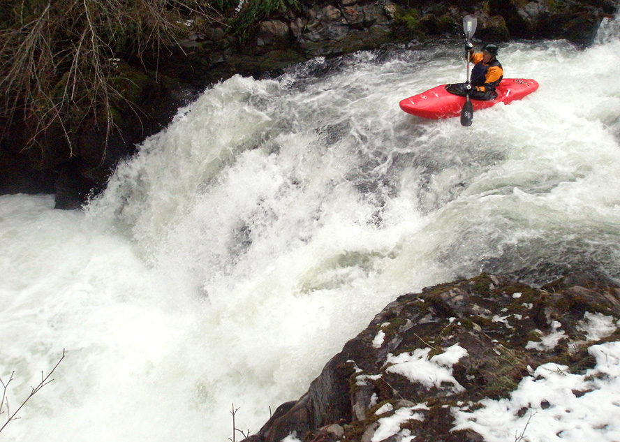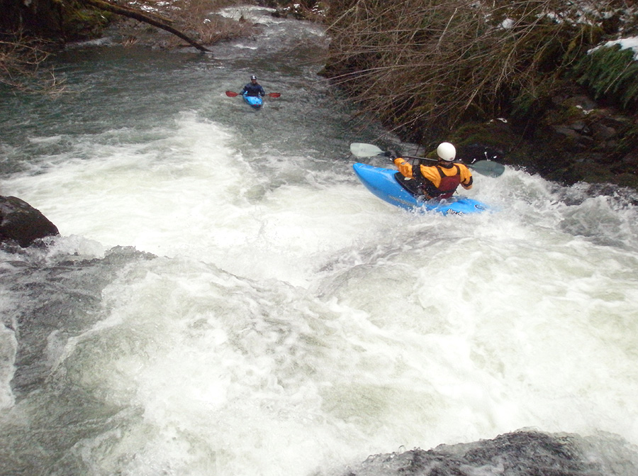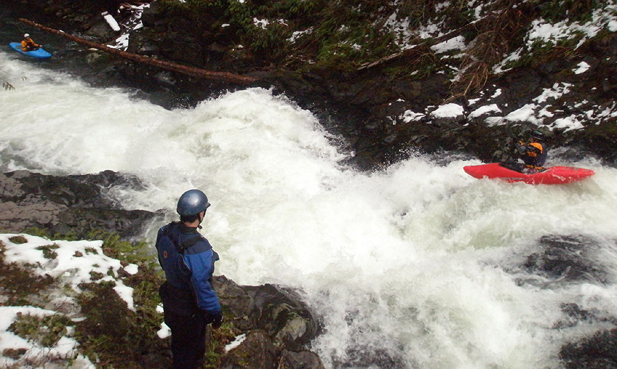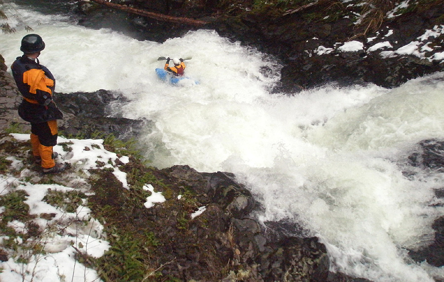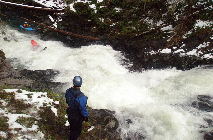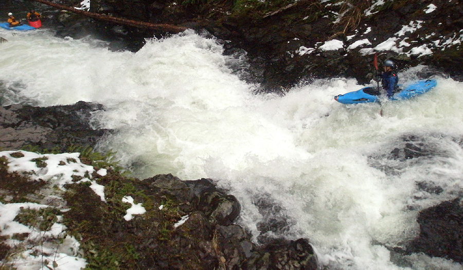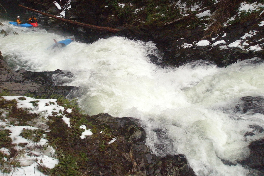 Once past the big falls, we arrived at the third and final falls on the North Fork, which is also the most frequently run. After a quick scout Josh probed it up on the left side, then Pete and Brad on the right, shown below. Everyone had good lines, stay upright, line up, and plug in..