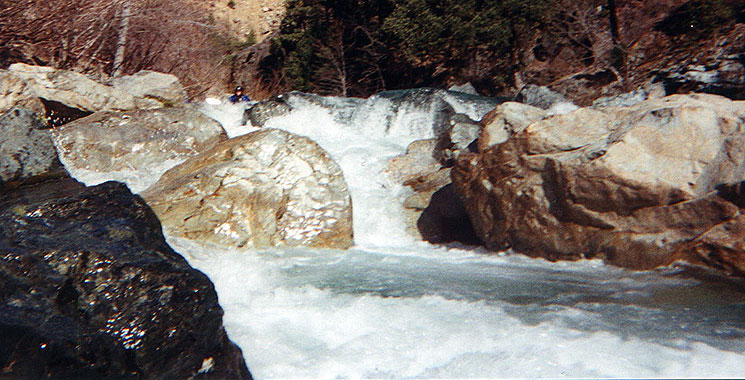 Upon rounding the corner we were greeted by the roar of a big class V drop. Within sight of the vehicle we were already clambering out of our boats to see down the frothy beast that dropped about 15 feet through a sequence of 3 drops. Perhaps this was the first portage indicated by Lars Holbeck? In retrospect I think it was, however there was a line and portaging so soon was an unbearable thought. Gabe elected to probe, a function he was to maintain throughout most of the descent. He charged down through the initial drops, tried to crash over a surging pile towards a clean drop on the right of a huge boulder, didn't have enough momentum and was momentarily side-surfing the huge pillow coming off a midstream boulder. Then the current forced him backwards, down the 6-foot drop to the left of that boulder and into the shallow water found there. Fortunately he just bounced off his stern and then leveled off into the eddy before heading on downstream a bit. I followed with a slightly different line in which I used the top portion of the pillow to shoot me left and into a huge eddy on far river left. Then Brad followed my line, didn't climb up high enough onto the pillow, and was sucked down into the nasty fold the pillow was creating on the left. He flipped going into the fold, but popped through and rolled easily. This rapid determined the pace of the entire day. Usually Gabe would probe, I would follow, and then Brad would come on through.