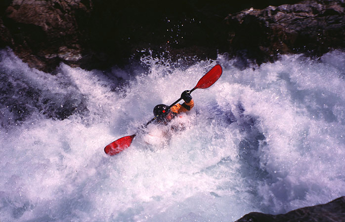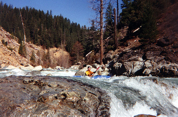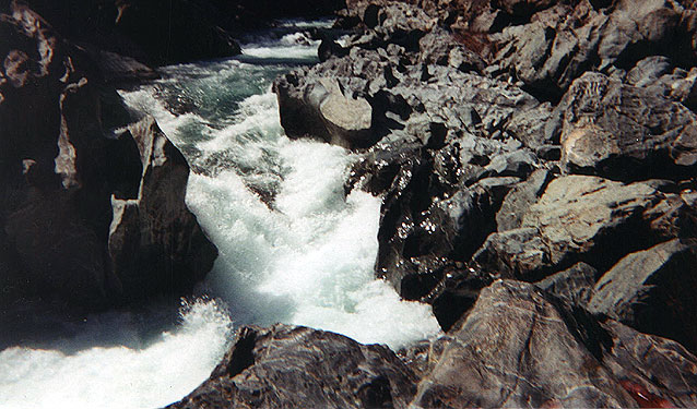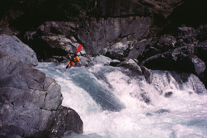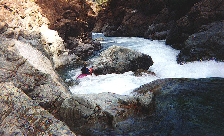 Somewhere in this initial 2 miles of mostly class V, I suffered my first vertical pin. While attempting to negotiate a narrow turn through the side of a big rapid, I stuck my boat's nose on the right bank, and had the stern pressed into a mid-chute boulder. I was upright, and stable, but going nowhere fast! I could have stepped out of my boat, but would have risked wrapping my boat full of water. So I sat there and waited for Brad and Gabe to lift and push on my bow until it slid free, allowing me to finish dropping through the narrow chute. Fortunately neither Gabe nor Brad had any problems on this one. There were so many big, intense rapids on this run that my mind has already grown cloudy with the details of all but the most memorable. Suffice it to say that below the initial tough class V section, the river settled into a steady rhythm of class IV, IV+, and V rapids as the river pool-and-dropped its way through the granite canyon. Occasionally a mile would mellow out to class III. In one of these easier stretches came the next memorable rapid. It was a steep flume with a swirly hole halfway down and what looked like an undercut left wall. Gabe probed, hit a seam and went deep enough to barely submerge his head, but popped on through. I followed, heading down from left to right a bit different than Gabe had. No problems. Didn't even get my helmet wet! Then Brad's turn was up. Unfortunately he hit that swirling hole, squirted his Micro 240's stern, and did a quick sequence of cartwheels before flushing out upside down. Again, he recovered quickly with a deft roll.