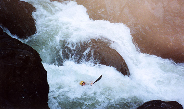 After a few smaller drops we arrived at a significant horizon line, and got out to scout on the left. What we saw looked good, and Jurgen probed the rapid without problems. Pete went next, flipped in the first drop (a deceptively tricky curler) and everyone got pretty excited but he snapped off a quick roll and ran the bottom two drops without problems. After that Tom and I scouted the lead-in carefully to be sure we didn't repeat Pete's excessively exciting line, and we had no problems. (This drop is referred to as 'Big Momma Jomba' in the Korb guidebook.) I went for the gut in the final drop and did a meltdown move into the pool below, very fun!