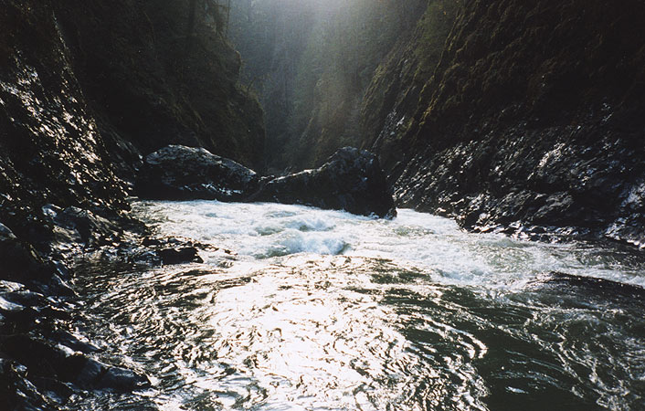 Now we were in the first gorge, and it was impressive, the mossy rock walls soaring hundreds of feet overhead, leaving no way out but down, which seems to be a common theme on the Olympic rivers I have paddled.